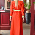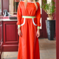 Sporty and feminine, this red dress features a ribbed knit waistline and cuffs in silver and anis, two slits in the front and a large boat neckline in a contrasting white jersey.